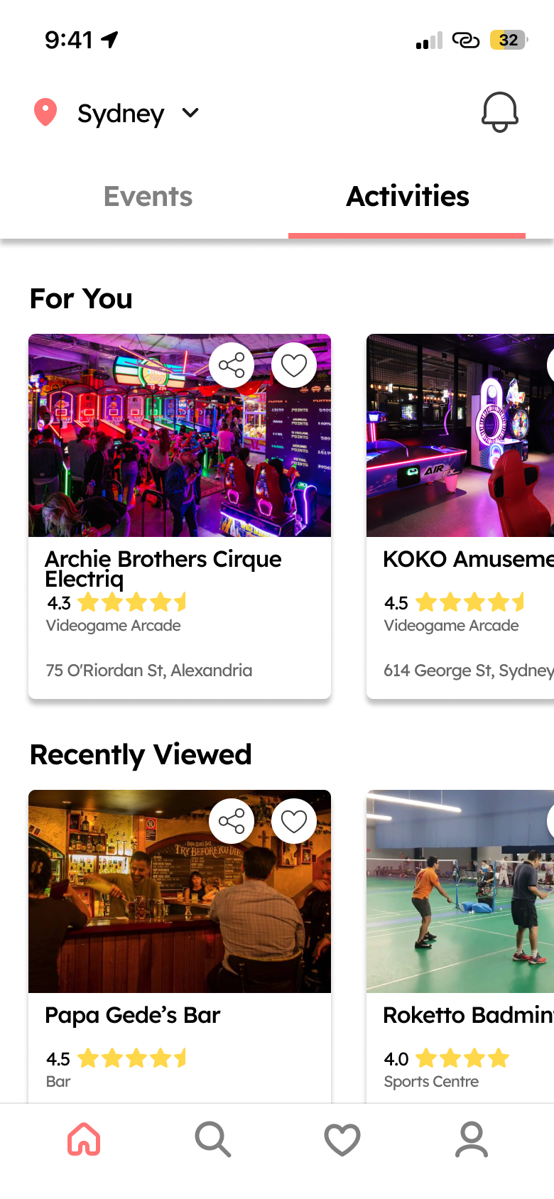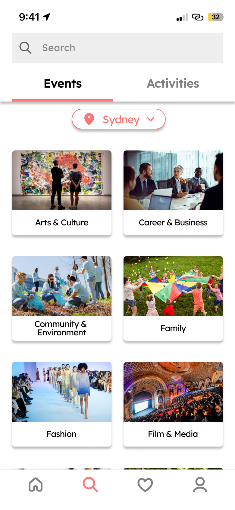 One the homepage, users can recommendations for events and activities personally curated for them as well as the ability to seamlessly switch between these category groups.