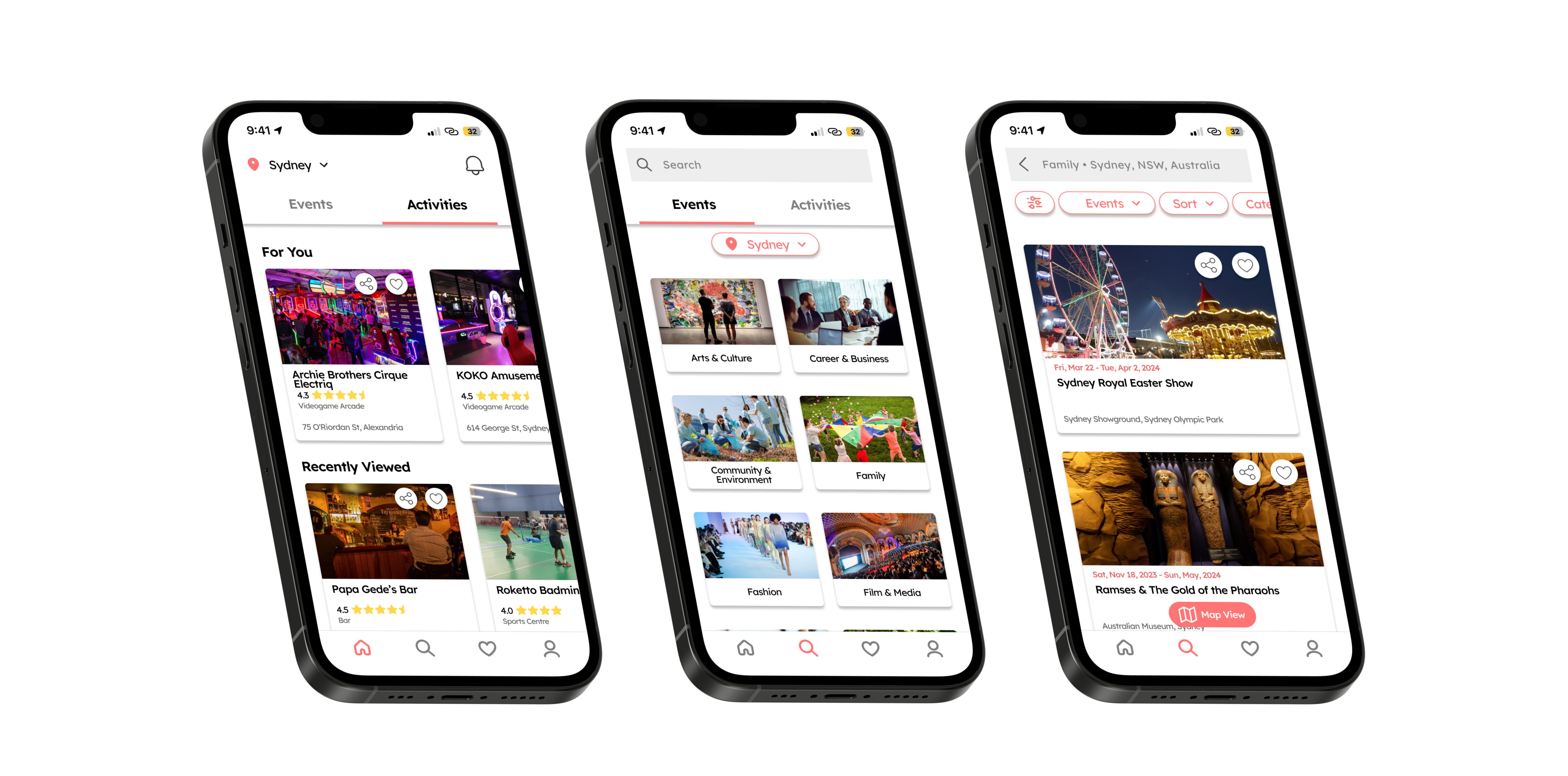 Using the system map as a blueprint, I began by developing the app prototype in low-fidelity, prioritising functionality and UI design. Subsequently, I elevated it to a high-fidelity design, focusing on integrating visual elements such as colours and iconography to refine the visual appearance and achieve the desired look for the final design. Overall, my approach for this design was to create a smooth browsing experience that encouraged exploration of different types of events and activities while also curating recommendations specific to the user.
